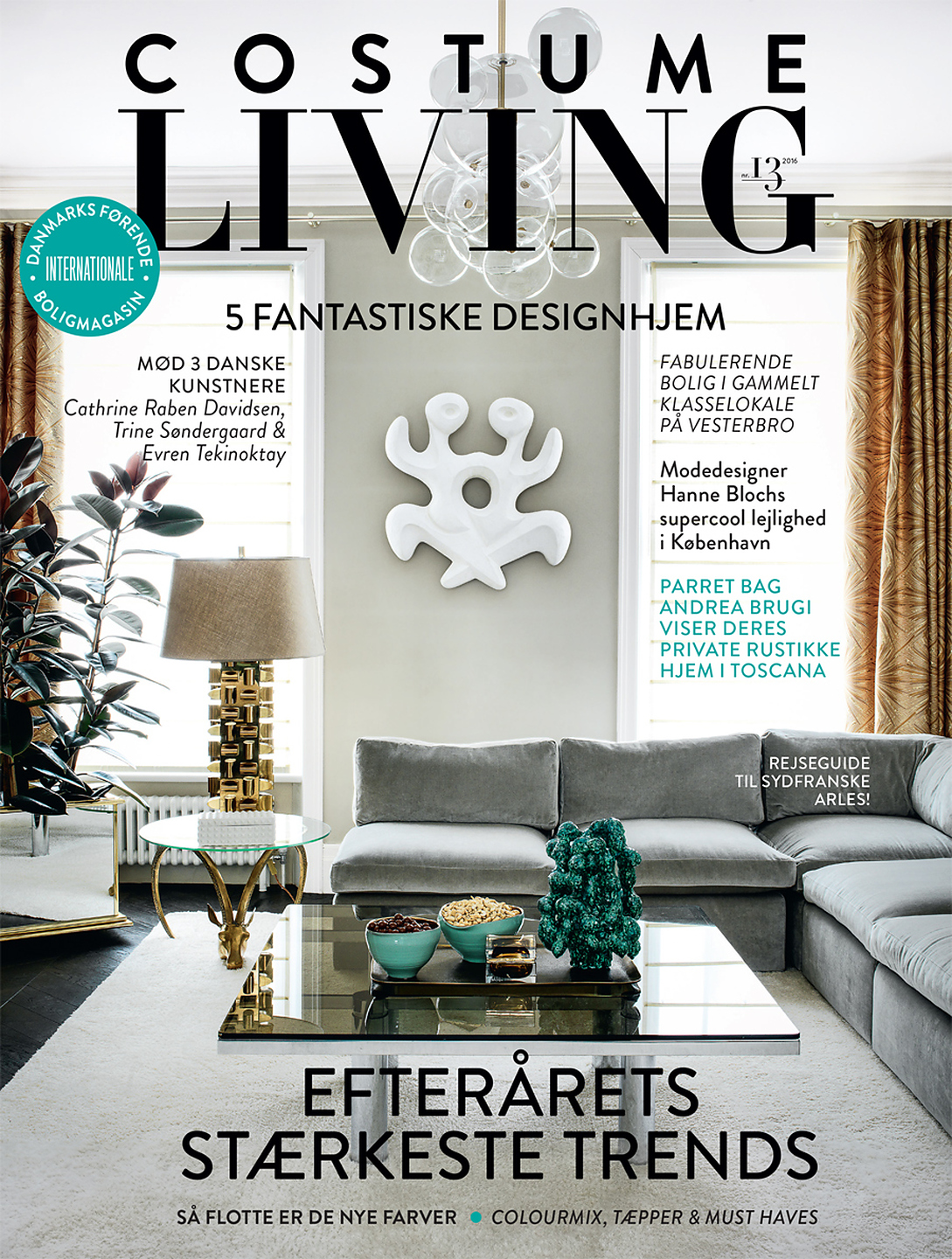 On cover and in article, "Gylden Geometri," interior designer Caroline Legrand featured Suede Lounge 4326 Plush Platinum in the living room of a client's home.